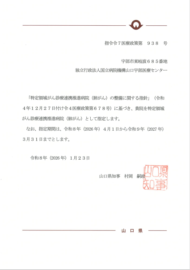 独立行政法人国立病院機構山口宇部医療センターは、平成27年4月1日より肺がん診療において、山口県における「特定領域がん診療連携推進病院(肺がん)」の指定を受けております。