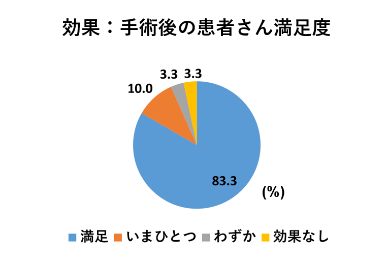 当院ではこれまで70人以上の患者さんに「胸腔鏡下胸部交感神経遮断術」を行っております。図1でお示ししますように、およそ83%の患者さんで満足いく効果:手の汗を減らすことができ、「積極的な行動がとれるようになった」、「仕事の能率が上がるようになった」等、喜んでいただき、期待どおりではないものの一定の効果を実感できた方も含めると、93.3%の患者さんで効果を確認できました。一方、手術をしても効果を実感できなかった患者さんが6.6%おられました。手術をしても、効果がない場合もあることを御了承ください。