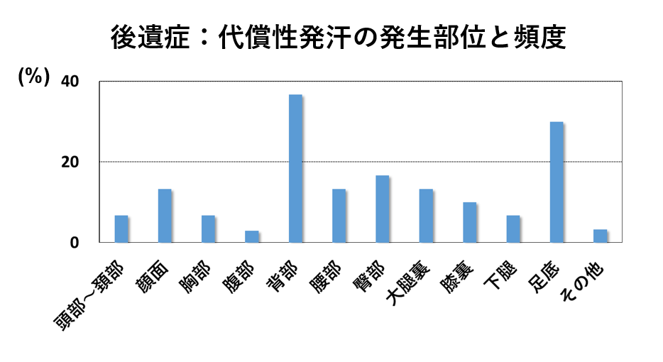 手術の後遺症として「代償性発汗」というものがあります。これは、手術後に背中、足底、臀部、大腿などの発汗が増える現象であり、術後に発症する割合はほぼ100%とされます。発症した場合の有効な治療法はありません。よって、手の症状の改善の有無にかかわらず、代償性発汗により、手術前よりも手術後に、苦痛が大きくなることもあります。手術を検討されるにあたっては、自分は本当に手の汗が多くて日常生活にも支障があるのか、そして、代償性発汗を受け入れられるのか、よく考えてから決めて下さい。当院における術後代償性発汗発生部位については、図2で示しますように、背部、足底、臀部に多い結果でした。背部から下半身とされますが、頭部や顔面に発症することもあります。一方、腋の汗は手掌同様に汗が減る効果が得られることもあります。
